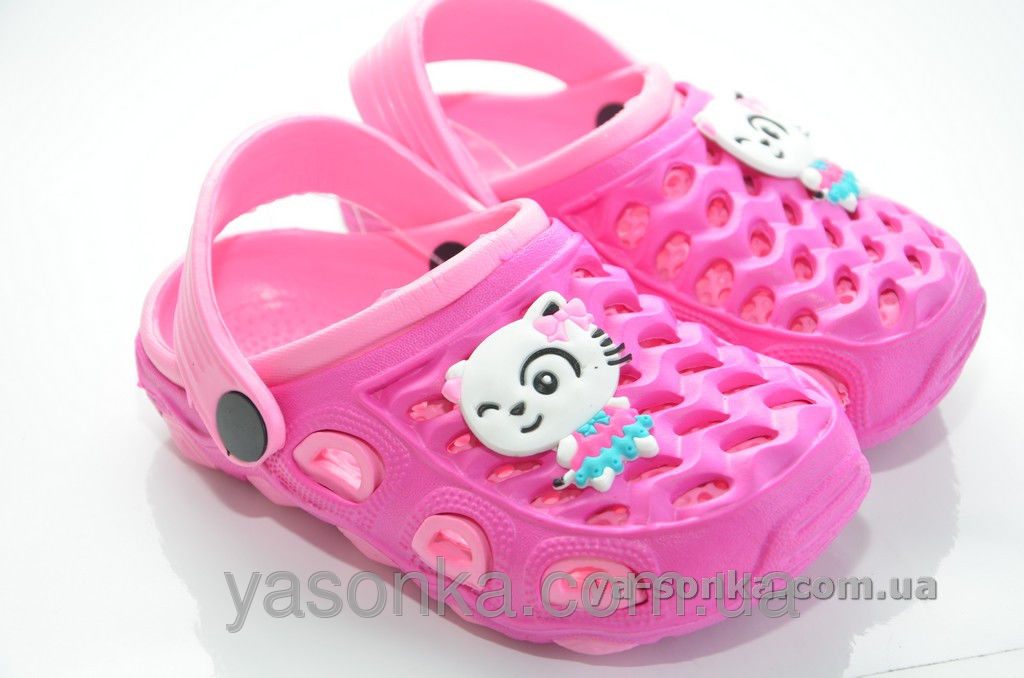 Кроксы для девочек. Яркая, красочная расцветка. Декор - джибитс с гламурным котиком. Изготовлены из  пенового материала. Обувь очень легкая, легко моется, быстро сохнет.  Есть супинатор для профилактики плоскостопия.