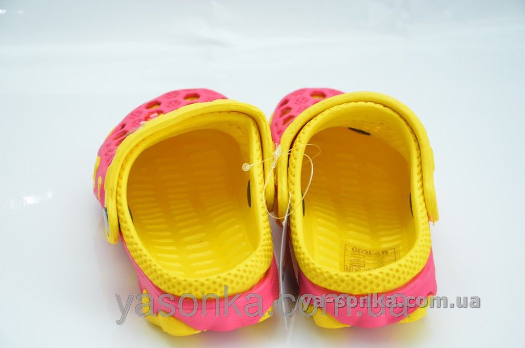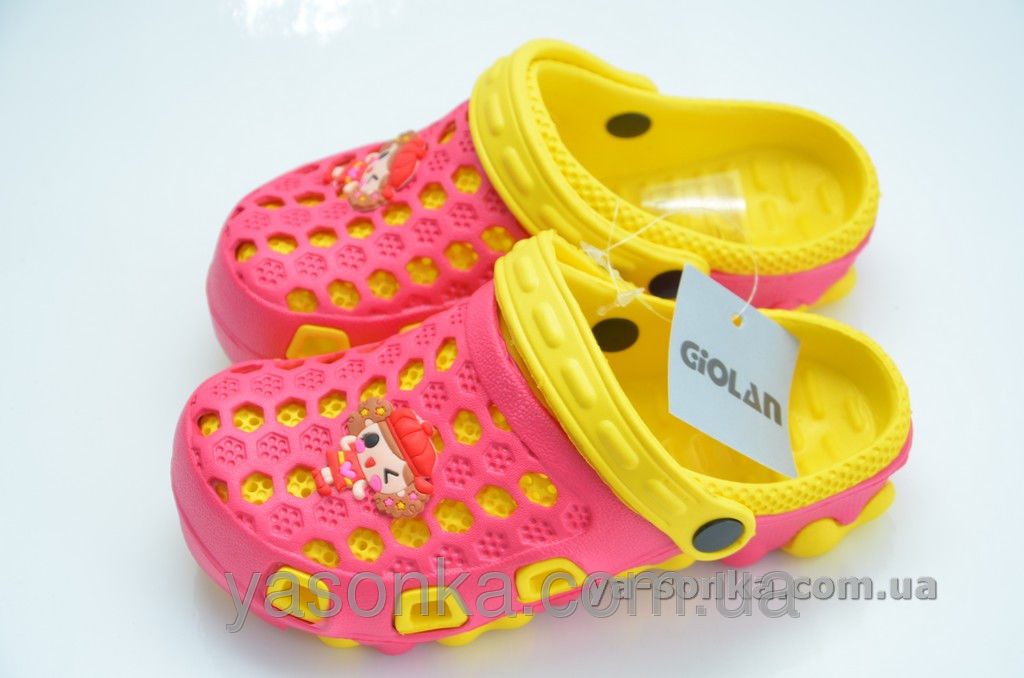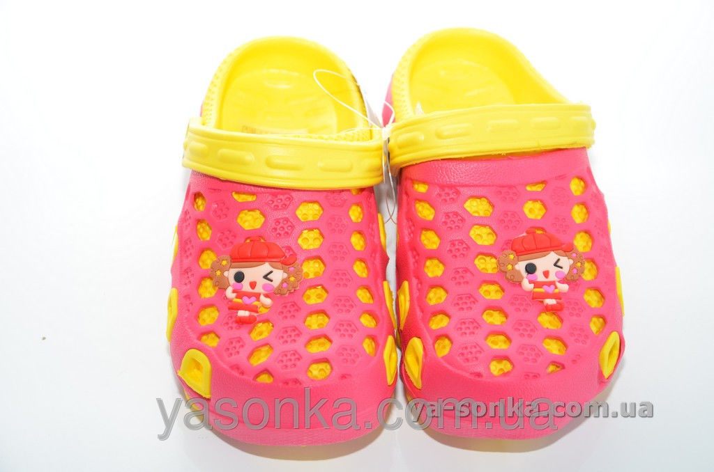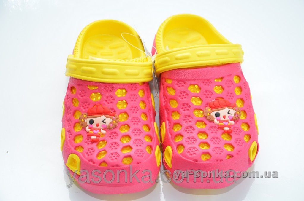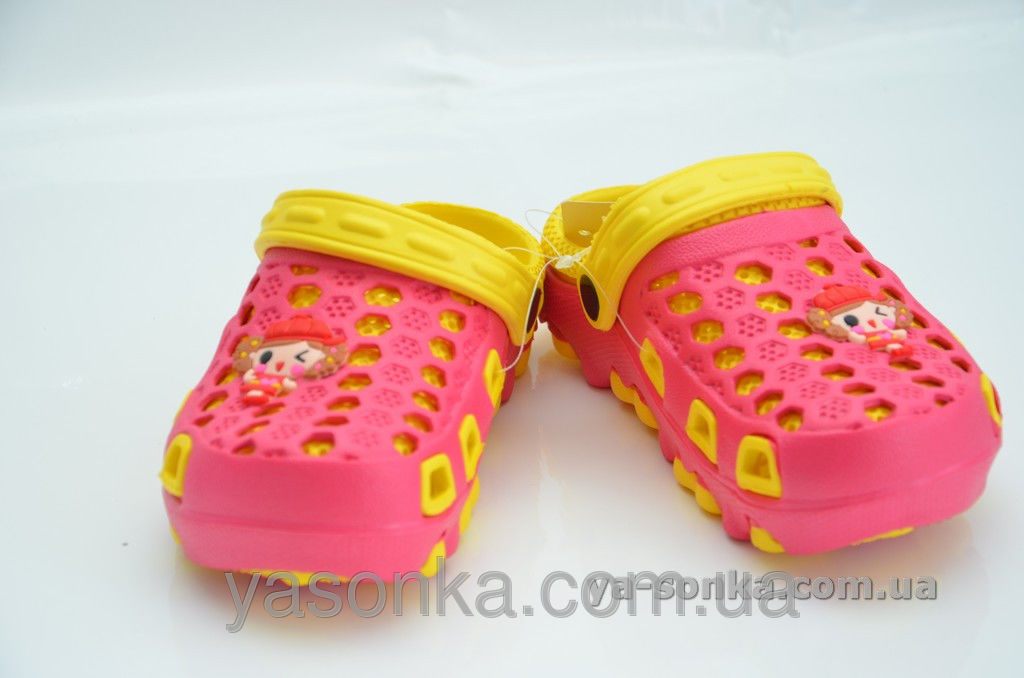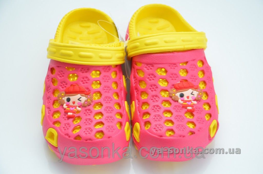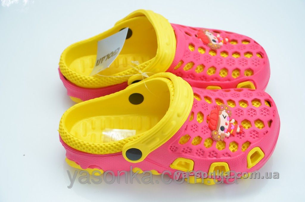 Кроксы для девочек. Яркая, красочная расцветка. Декор - джибитс с девочкой. Изготовлены из  пенового материала. Обувь очень легкая, легко моется, быстро сохнет.  Есть супинатор для профилактики плоскостопия.