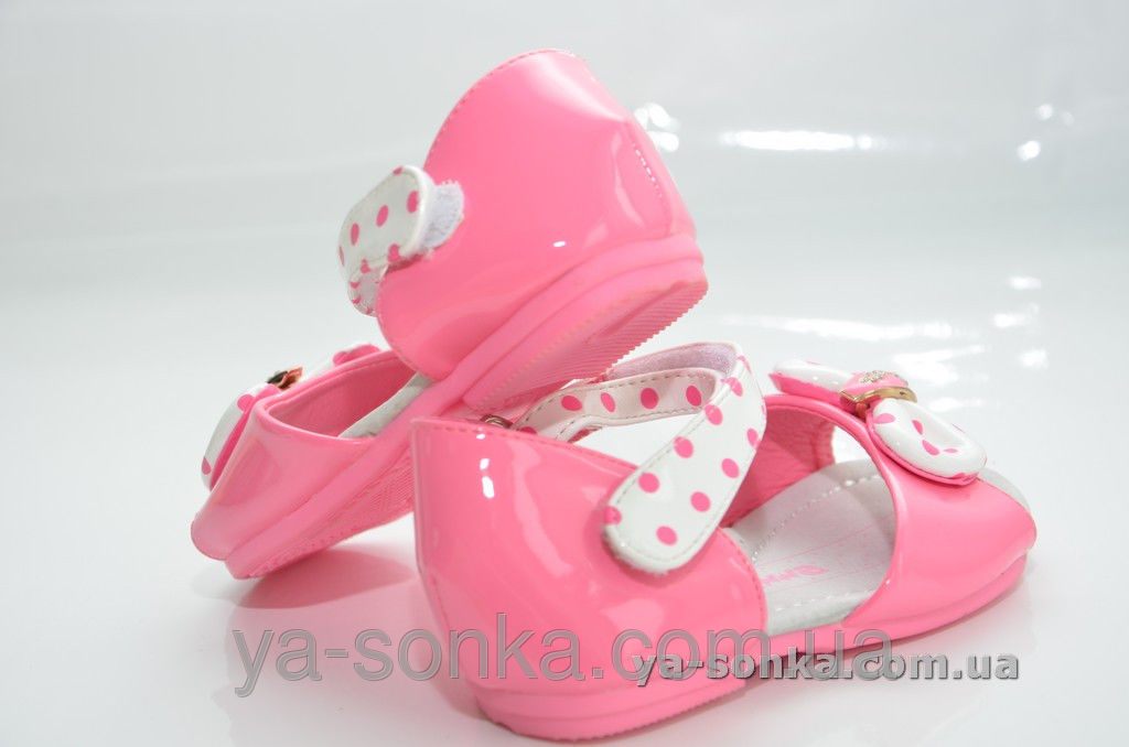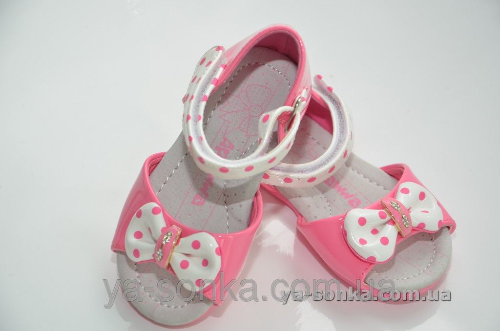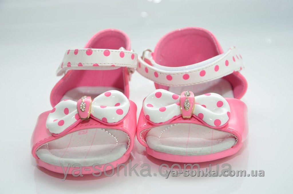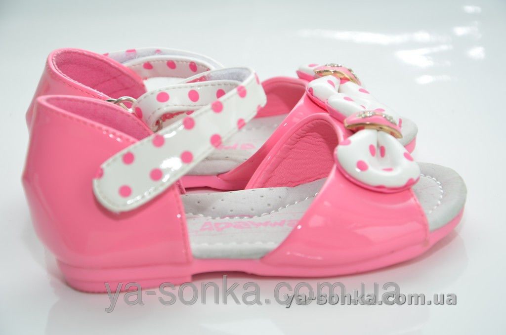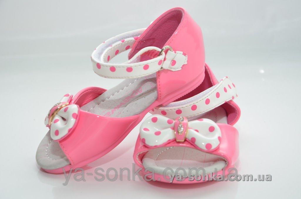 Босоножки для девочки. Изготовлены из современного качественного кожзама под лак. Модный стильный  дизайн. Элегантный бантик с брошкой. Кожаная стелька. Есть супинатор. Ремешок под цвет бантика с удобной застежкой на липучке. Закрытый, завышенный, нежесткий задник.