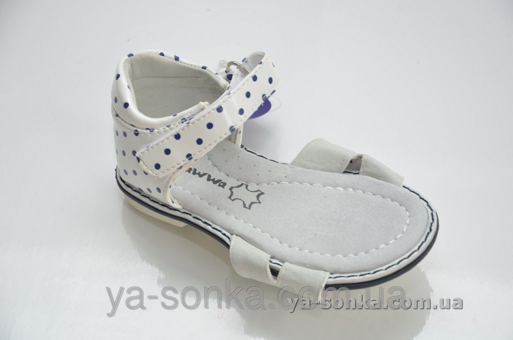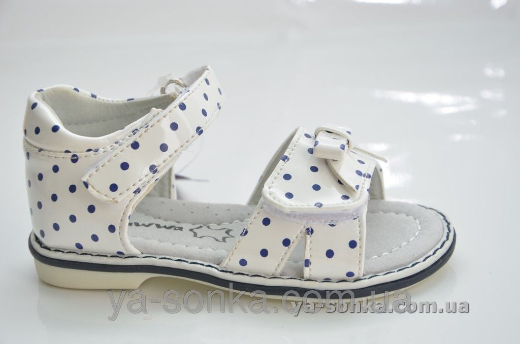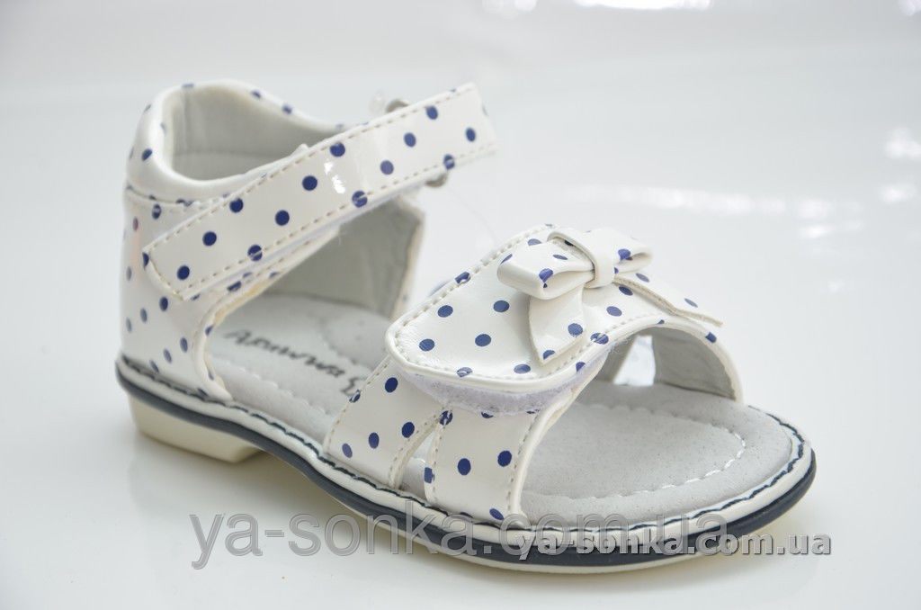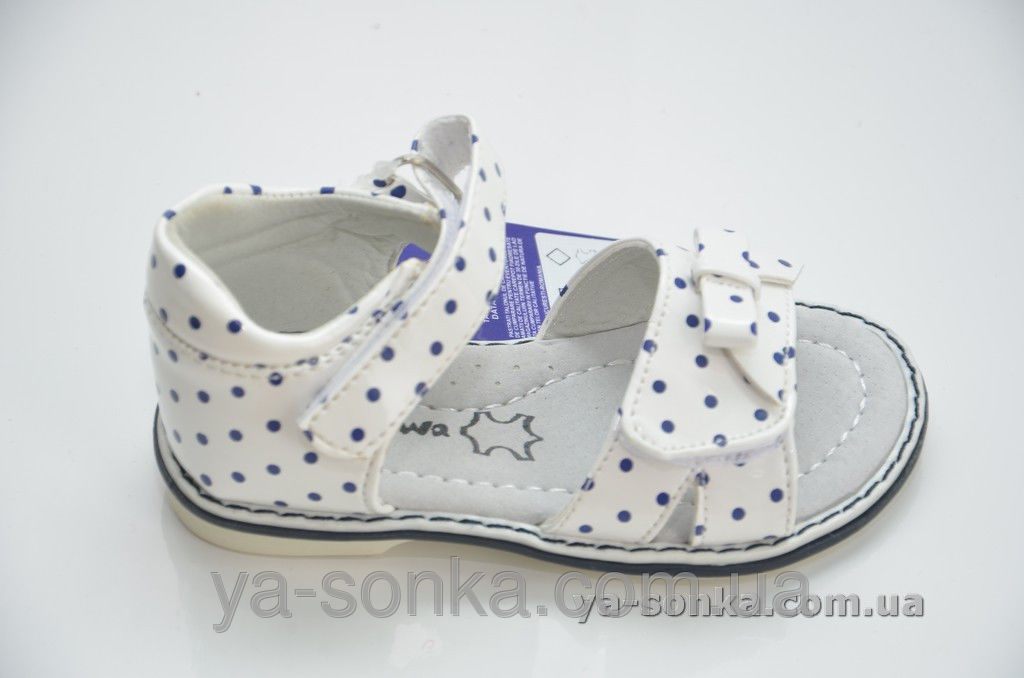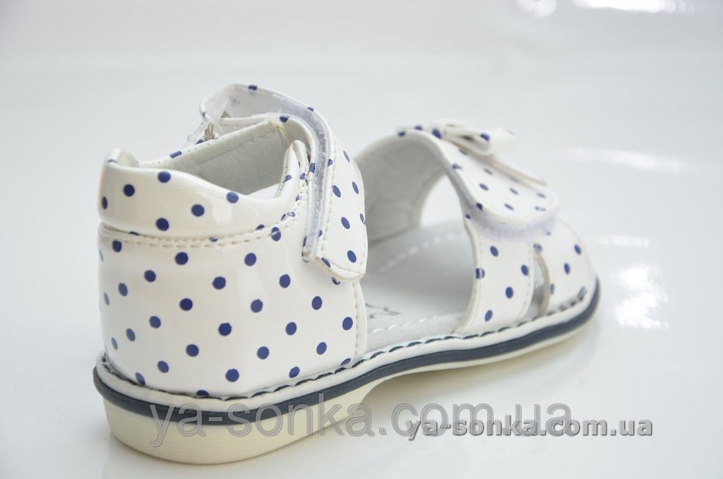 Босоножки для девочки. Изготовлены из современного качественного кожзама под лак. Модный нескучный дизайн в горошек. Элегантный бантик. Кожаная стелька. Есть супинатор. Удобная застежка на липучке регулирует полноту. Закрытый, завышенный, в меру жесткий задник.