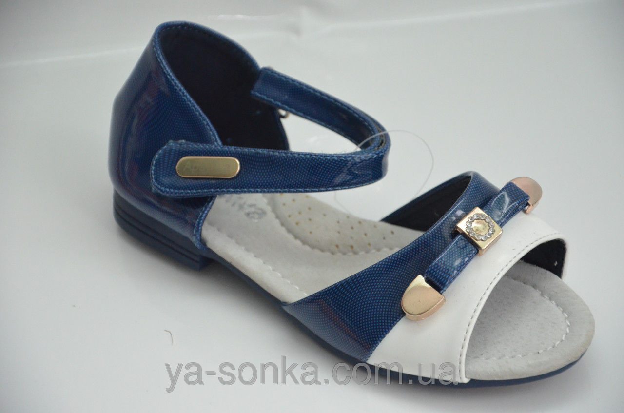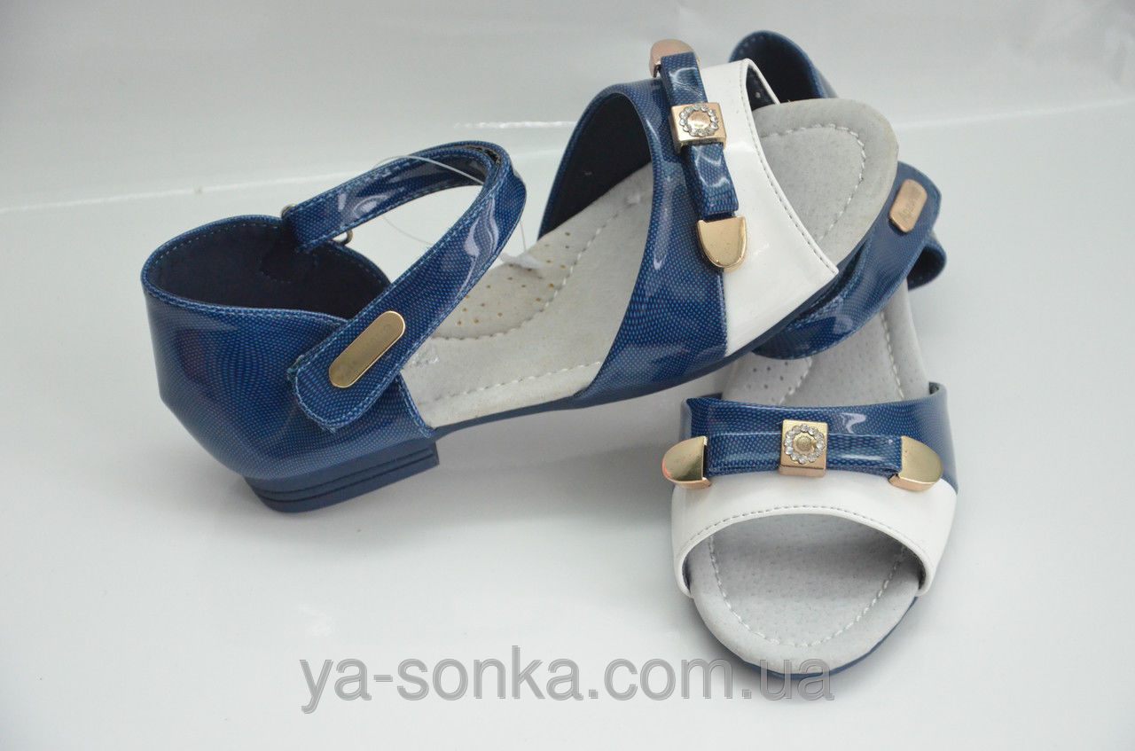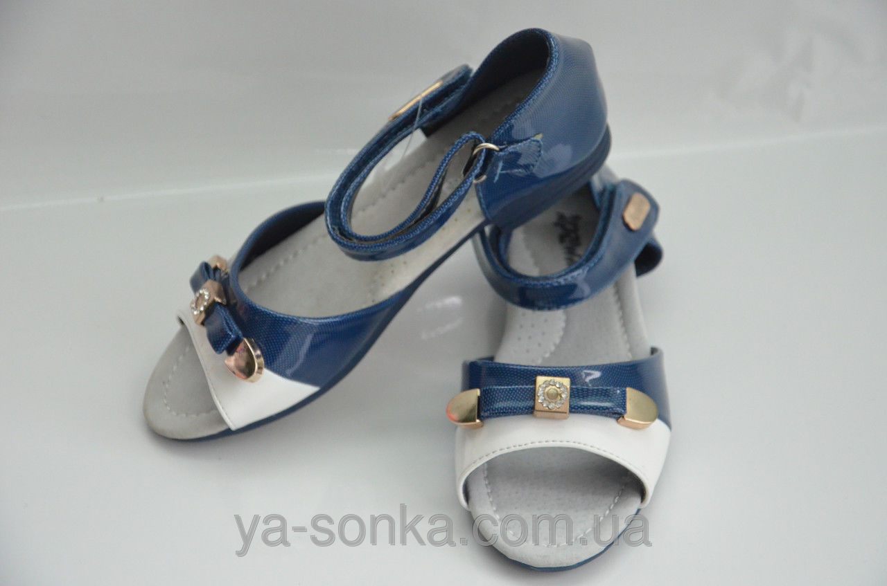 Босоножки для девочки. Изготовлены из современного качественного кожзама под лак. Модель выполнена из материалов в классической комбинации двух цветов. Украшение - элегантный бантик со стразами пдд "Сваровски". Кожаная стелька с супинатором. Ремешек з застежкой на липучке регулирует полноту ножки. Закрытый задник.