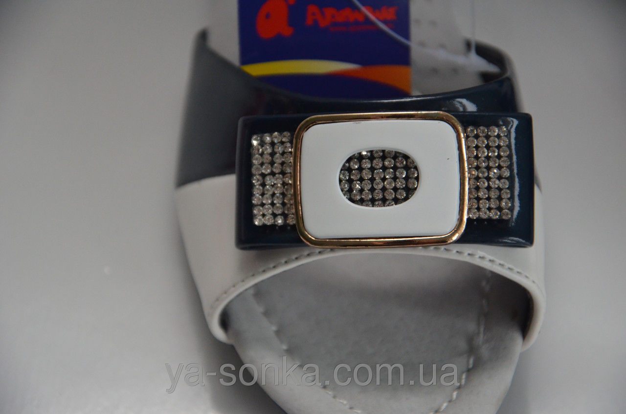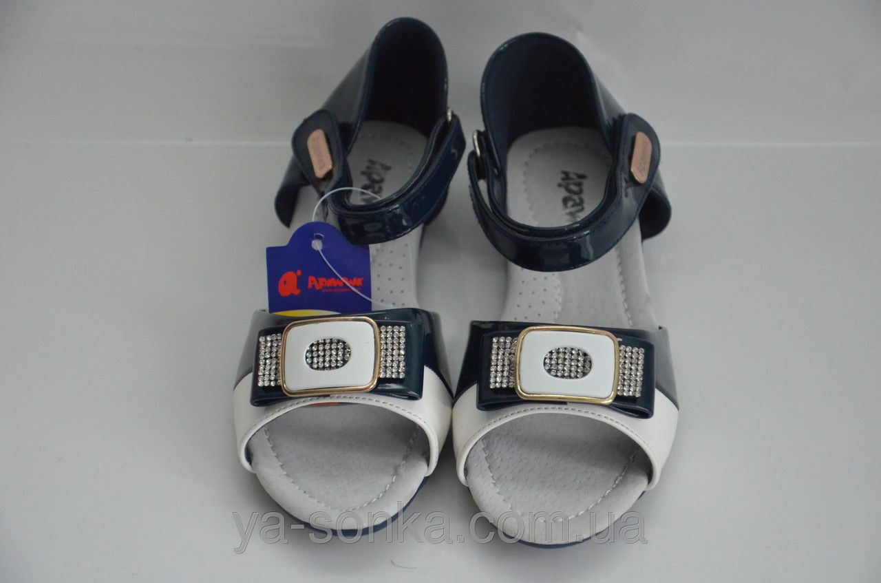 Босоножки для девочки. Изготовлены из современного качественного кожзама под лак. Модель выполнена в комбинации двух цветов. Украшение - бантик с брошкой с камнями под "Сваровски". Внутри кожаная стелька. Есть супинатор. Удобная застежка на липучке фиксирует ножку с любой полнотой.