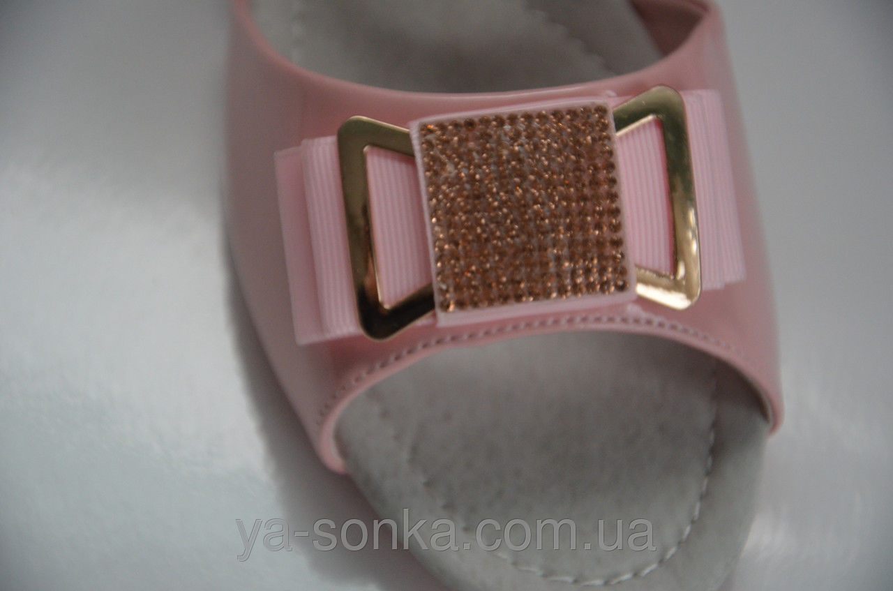Босоножки для девочки. Изготовлены из современного качественного кожзама под лак. Современный модный дизайн. Украшение - шикарный бантик со стразами под "Сваровски". Внутри кожаная стелька. Есть супинатор. Удобная застежка на липучке фиксирует ножку с любой полнотой.