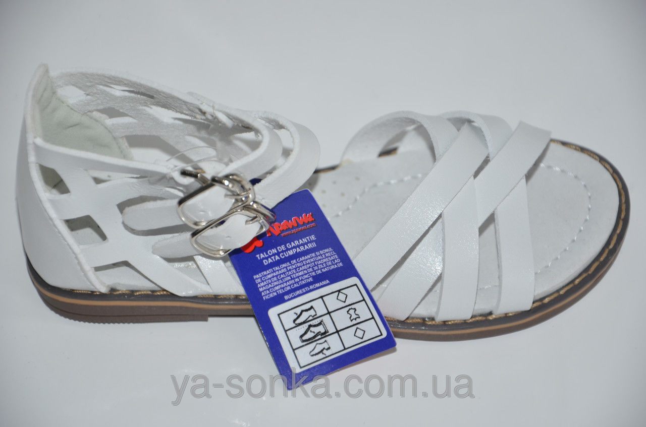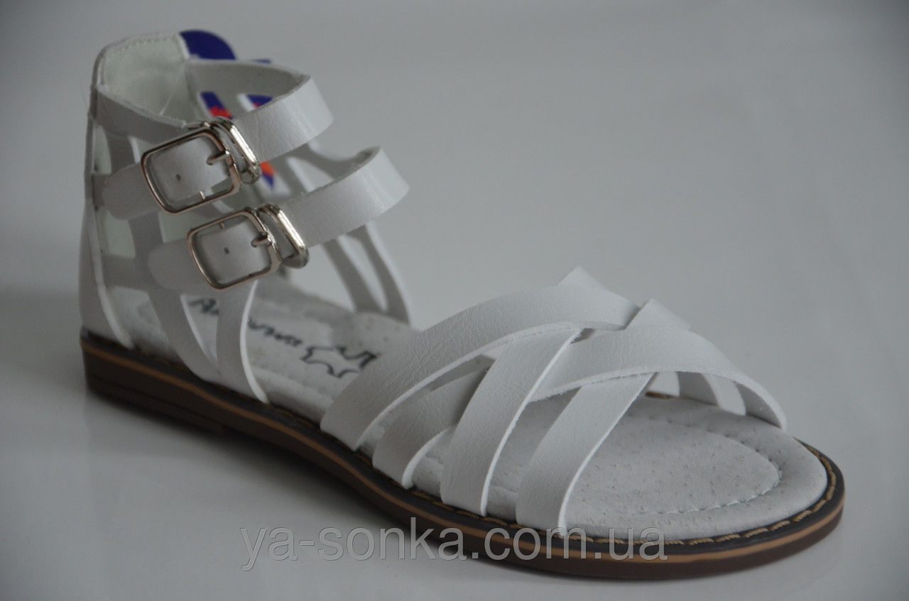 Босоножки для девочки в греческом стиле. Изготовлены из современного качественного кожзама. Кожаная стелька. Есть супинатор. Закрытая пятка. Удобные при обувании застежки на крючках лишь имитируют пряжечки.