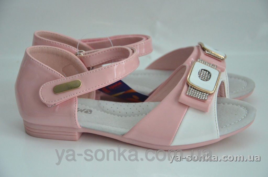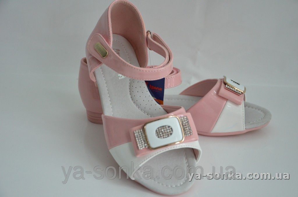 Босоножки для девочки. Изготовлены из современного качественного кожзама под лак.  Модель выполнена в сочетании двух цветов. Кожаная стелька. Есть супинатор. Удобная застежка на липучке регулирует полноту. Закрытый в меру жесткий задник.