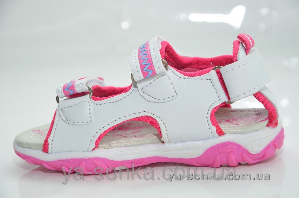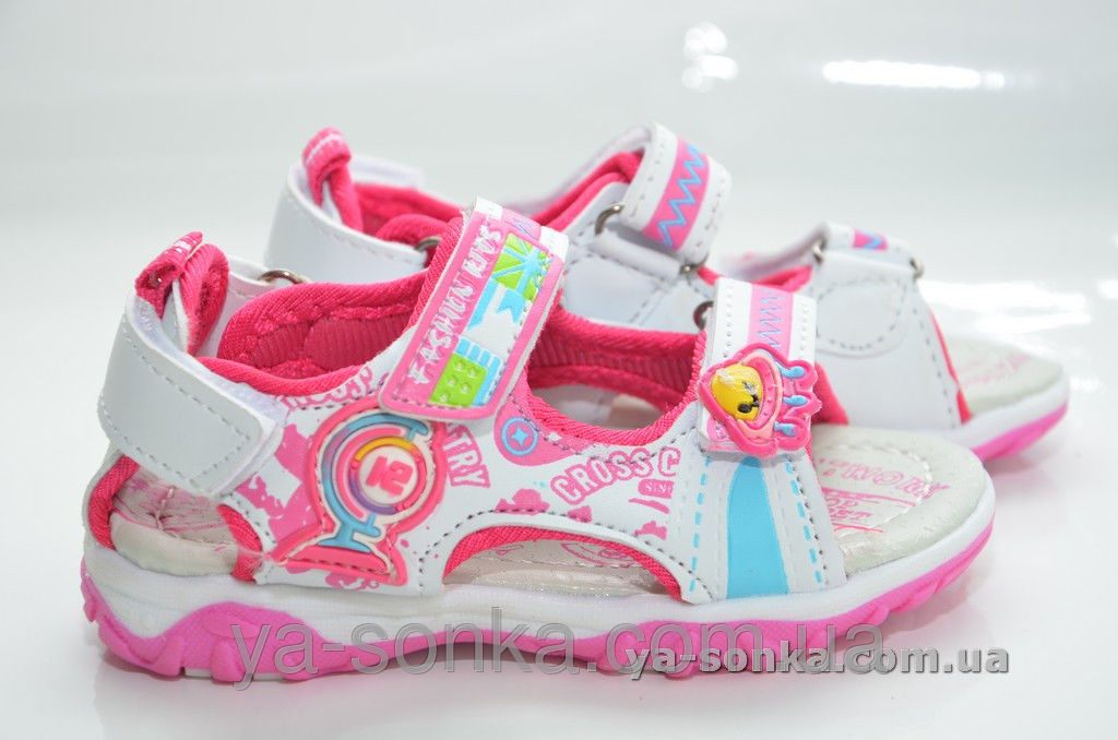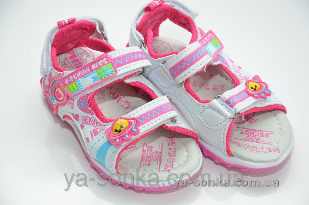 Открытые босоножки-сандалии для девочки  изготовлены из качественного кожзама. Красочная, яркая расцветка. Дизайн в спортивном стиле. Модель декорирована детскими забавными аксессуарами. Внутри мягкий текстиль. Стелька с супинатором. Три застежки на липучках позволяют максимально комфортно регулировать босоножки на ножке с любой полнотой.