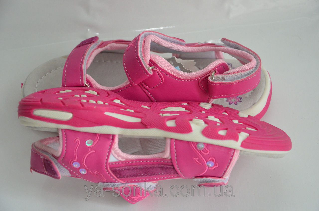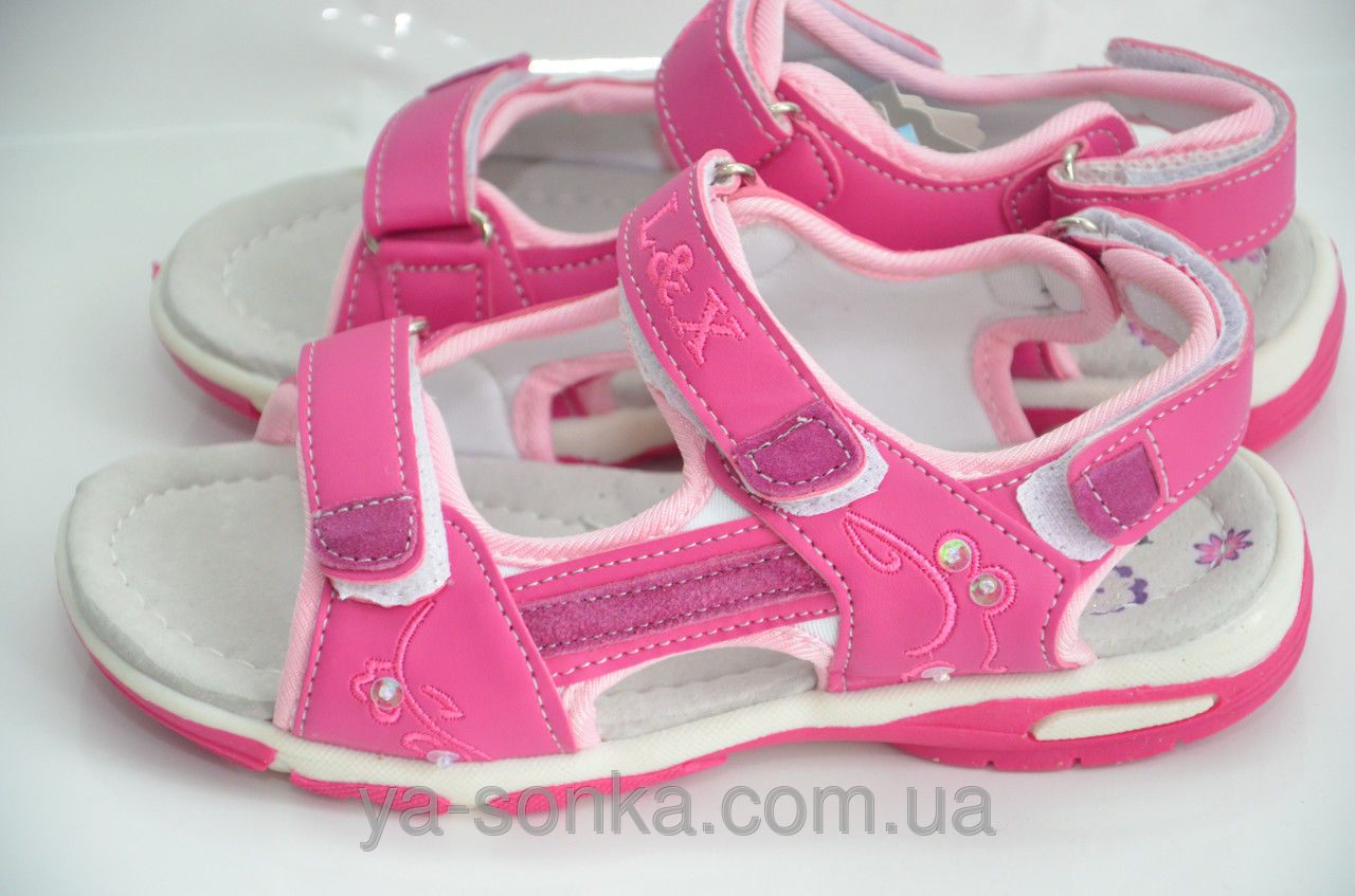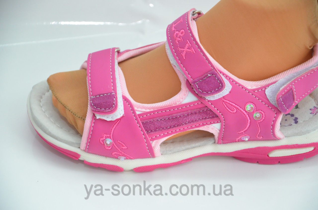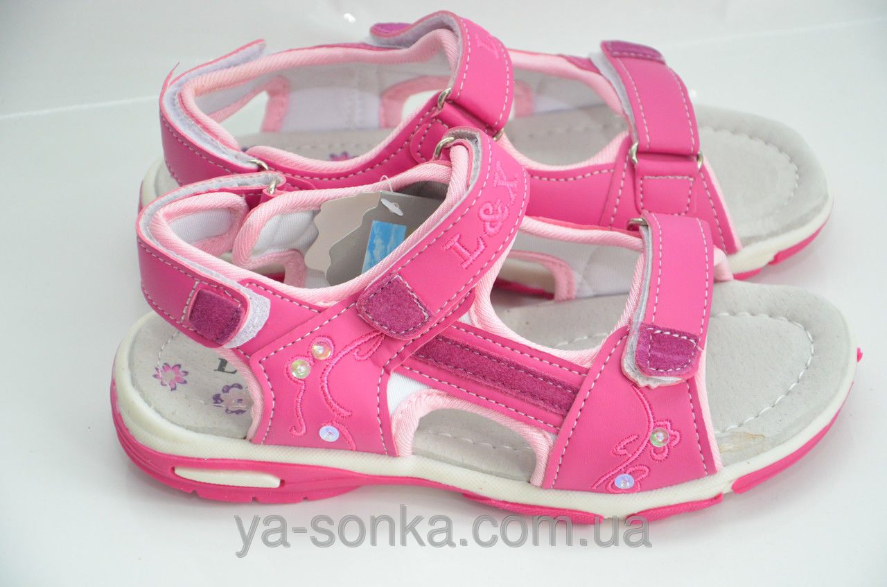 Открытые босоножки-сандалии для девочки изготовлены из качественного кожзама. Дизайн выполнен в спортивном стиле, дополненном милыми девичьими аксессуарами. Модель декорирована  вышивкой, камешками.  Есть три застежки на липучках, что позволяет максимально комфортно регулировать босоножки на ножке с любой полнотой. Внутри мягкие,  мягкое основание стелечки. Стелька кожаная  с супинатором.