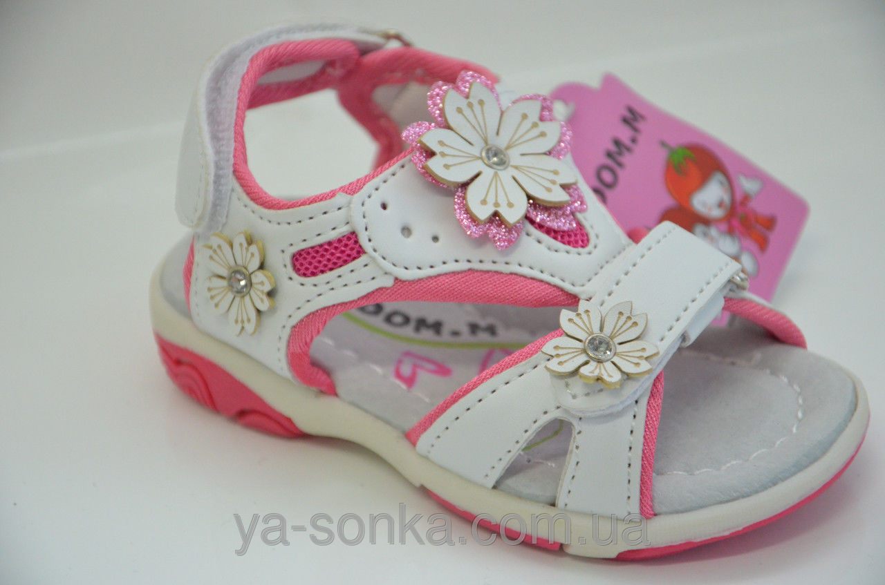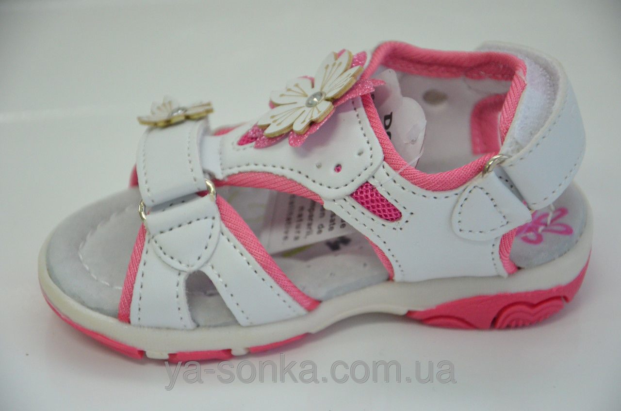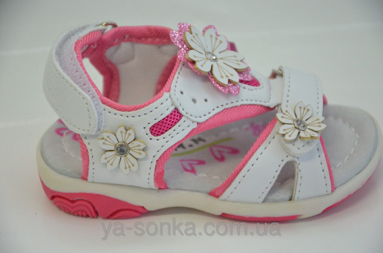 Открытые босоножки-сандалии для девочки изготовлены из качественного кожзама. Оригинальный нарядный дизайн. Выполнены в комбинации белого и розового цветов. Модель декорирована цветочками с камешками. Кожаная мягкая стелька с супинатором. Застежка на липучке регулирует модель на ножке с любой полнотой.