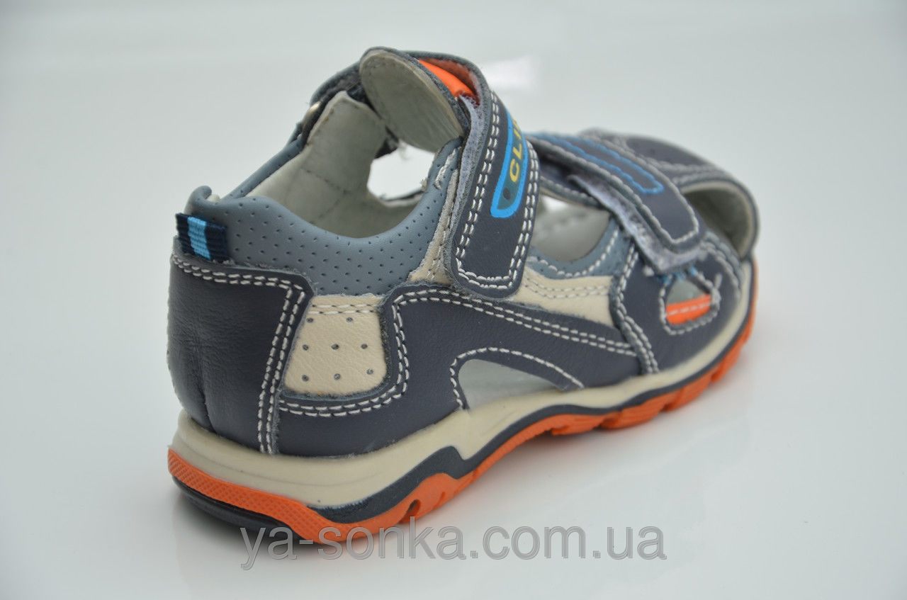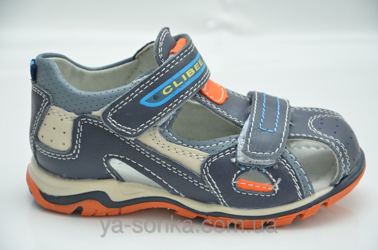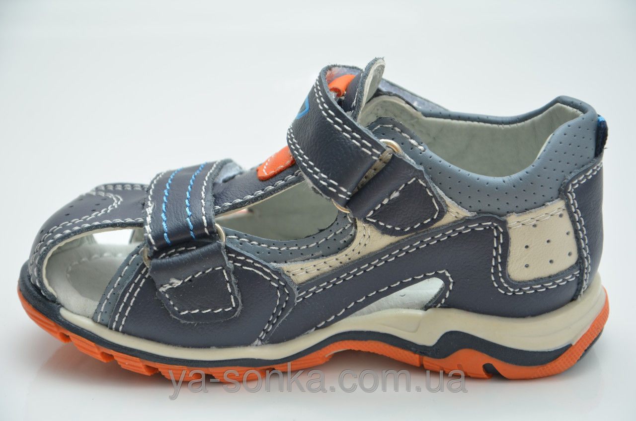 Модные сандалии для маленького мальчика. Изготовлены из натуральной кожи. Закрытый в меру жесткий задник. Закрытый носочек.  Внутри кожаная стелька с супинатором. Две функциональные застежки-липучки зафиксируют ножку любой полноты. Модный спортивный дизайн. Универсальная, комфортная, здоровая модель для Вашего мальчика.