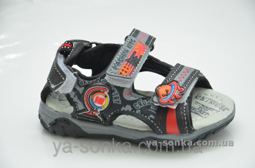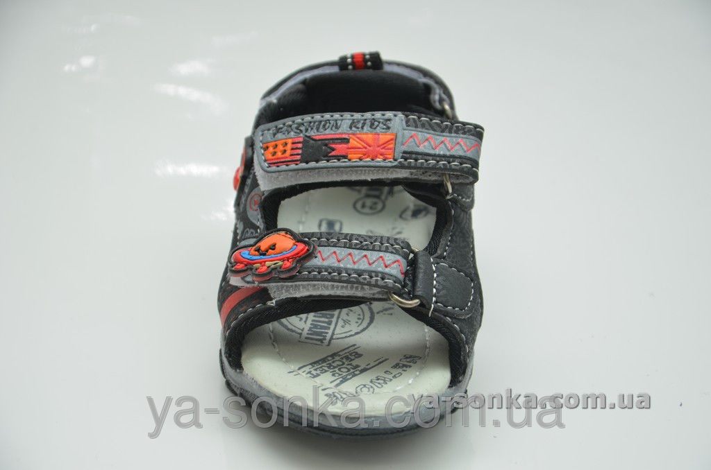 Модные сандалии для мальчика изготовлены  из современного качественного кожзама. Нескучный дизайн выполнен  в спортивном стиле, украшен прикольными детскими аксессуарами. Есть три функциональные застежки на липучках, что позволяет максимально  регулировать модель на детской ножке с любой полнотой. Внутри мягкий текстиль, мягкое основание, стелька с супинатором.