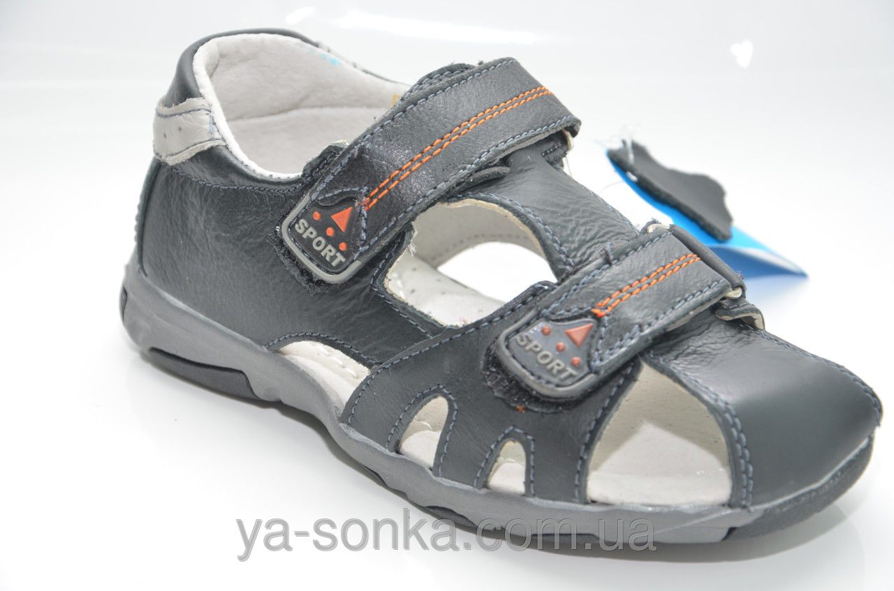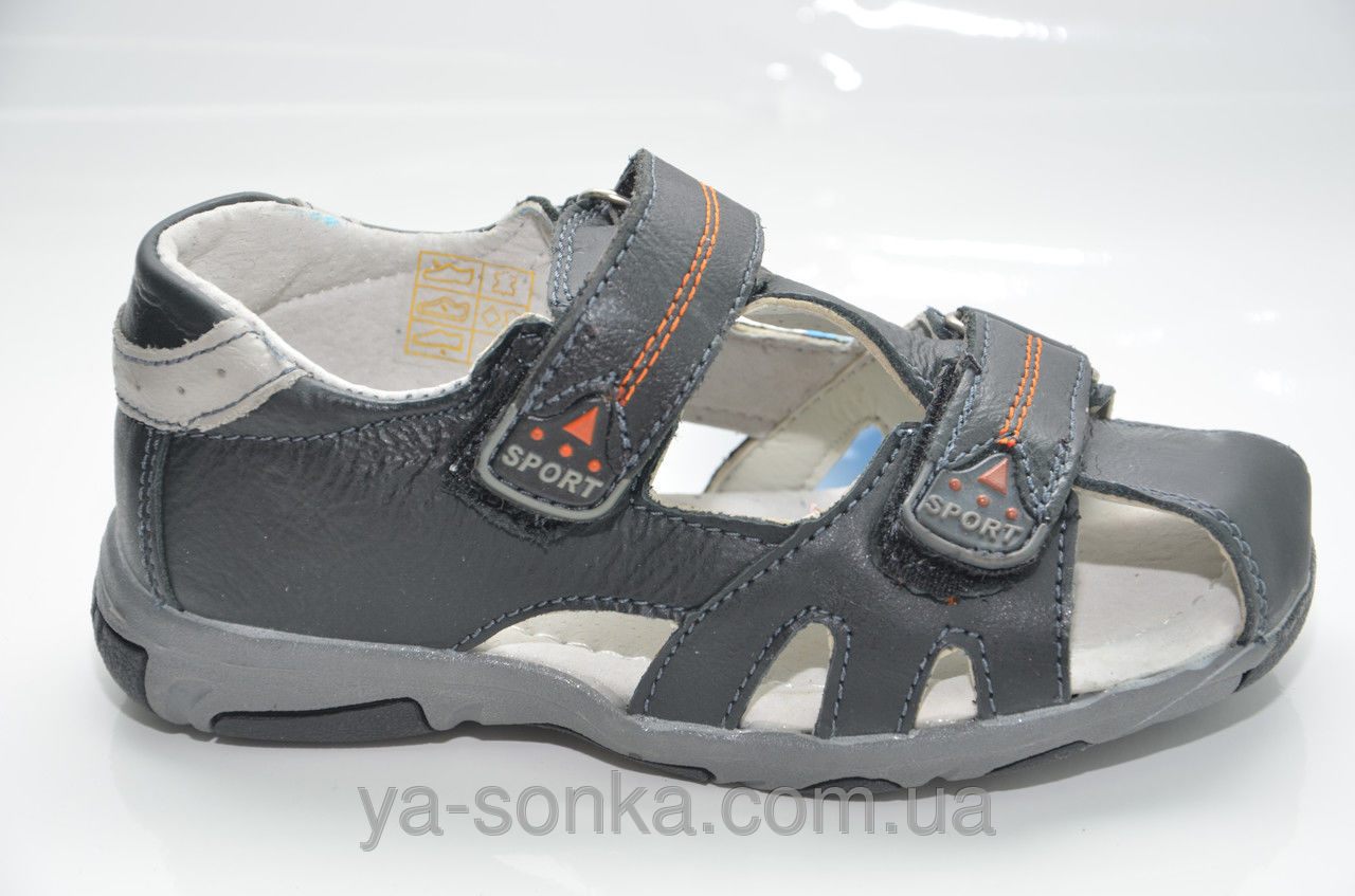 Модные и стильные сандалии для мальчика. Верх изготовлен из кожи.  Прикрытые пальчики, закрытая пятка. Две функциональные застежки на липучках позволят максимально точно регулировать подъем и полноту детской ножке.  Внутри кожаная стелька с супинатором.