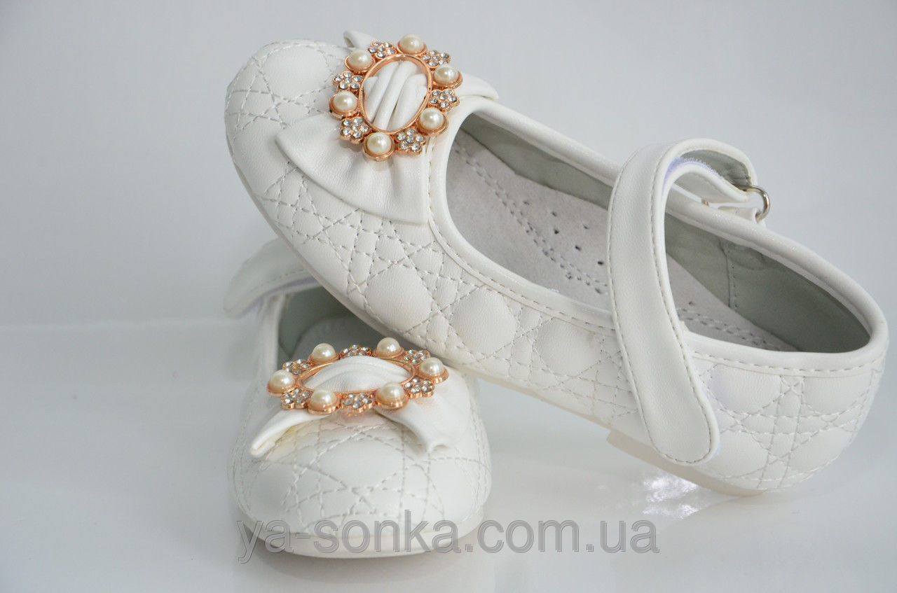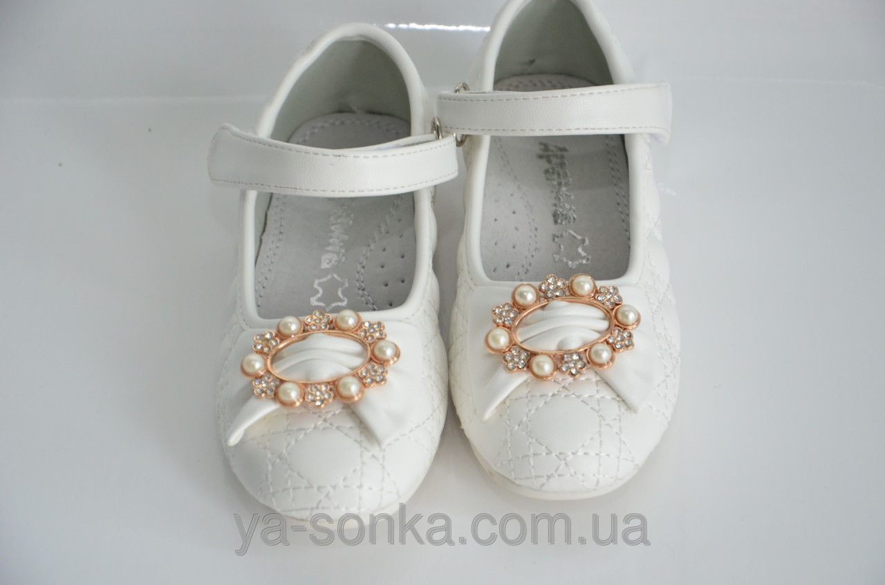 Стильные, модные туфельки для девочки. Выполнены из мягкого кожзама белого цвета. Декоративная строчка. Довольно открытая модель. Ремешок позволяет надежно фиксировать туфельки на ножке. Застежка на липучке. Модель украшена бантиком с шикарной брошкой с жемчугом и стразами.