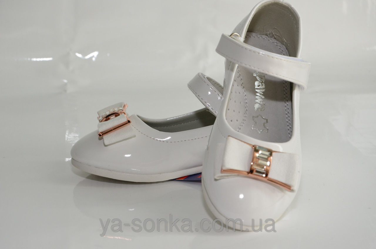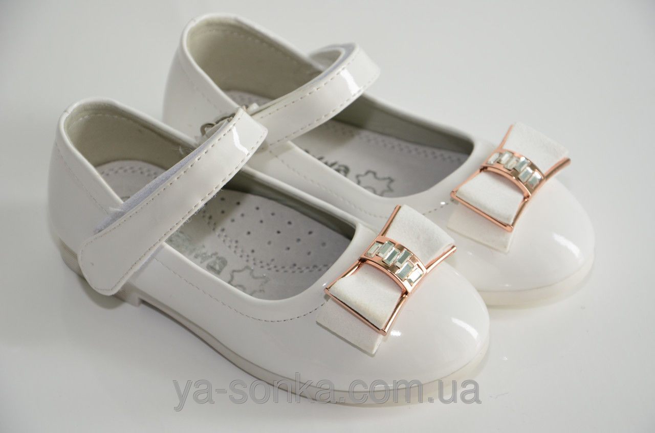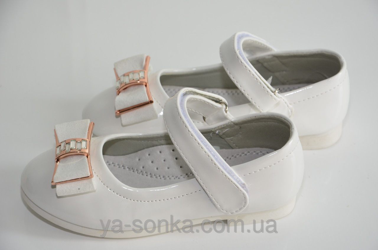 Стильные, модные туфельки для девочки. Выполнены из качественного кожзама белого цвета под лак. Лаконичный дизайн. Ремешок с застежкой на липучке регулирует полноту ножки. Модель украшена красивым бантиком с брошечкой.