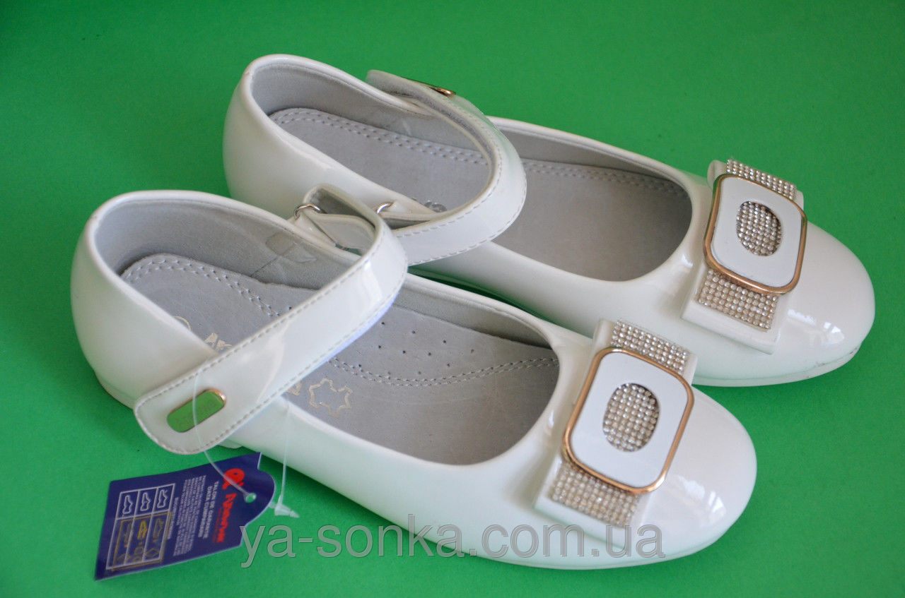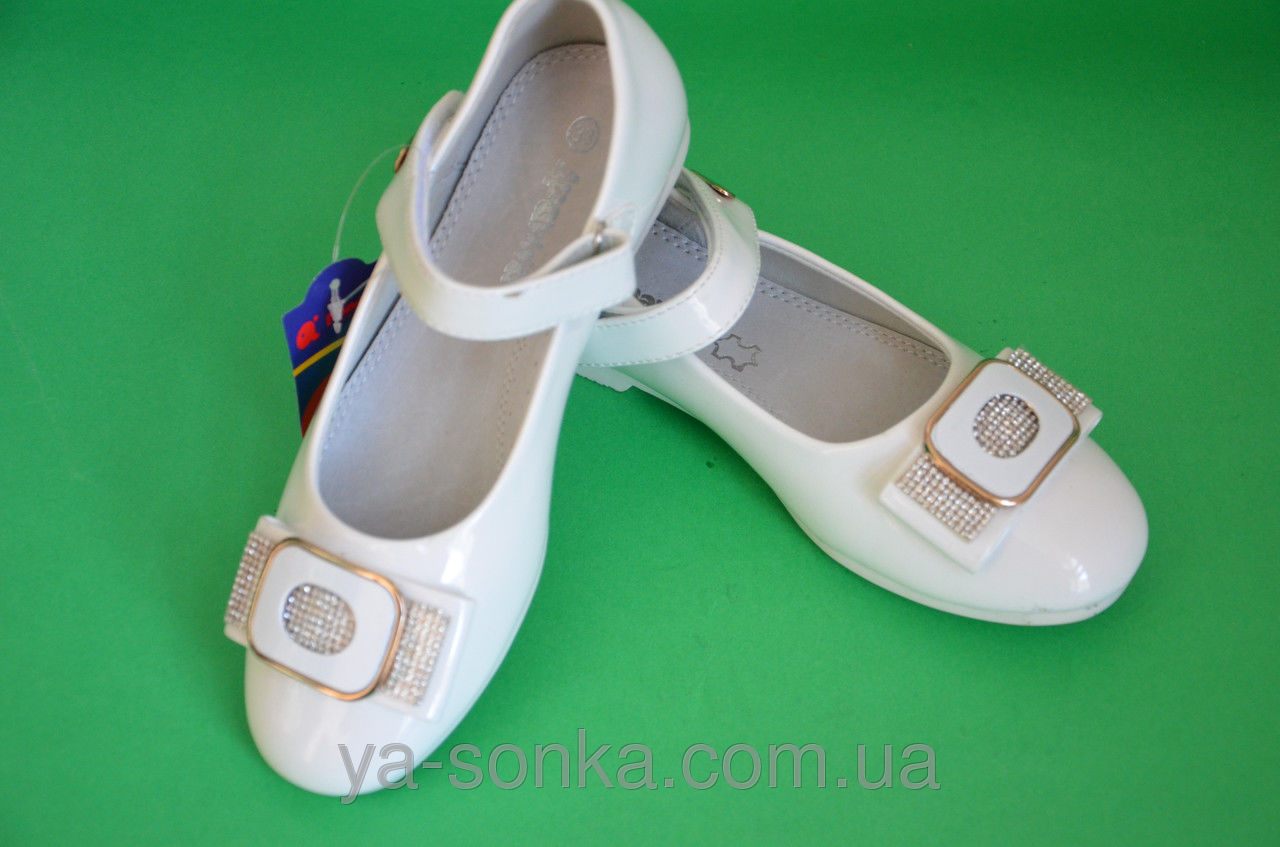 Стильные, модные туфельки для маленькой леди.  Выполнены из качественного кожзама белого цвета под лак. Довольно открытая модель. Ремешок позволяет надежно фиксировать туфельки на ножке. Застежка на липучке. Модель украшена дизайнерской брошкой с камнями под "Сваровски".