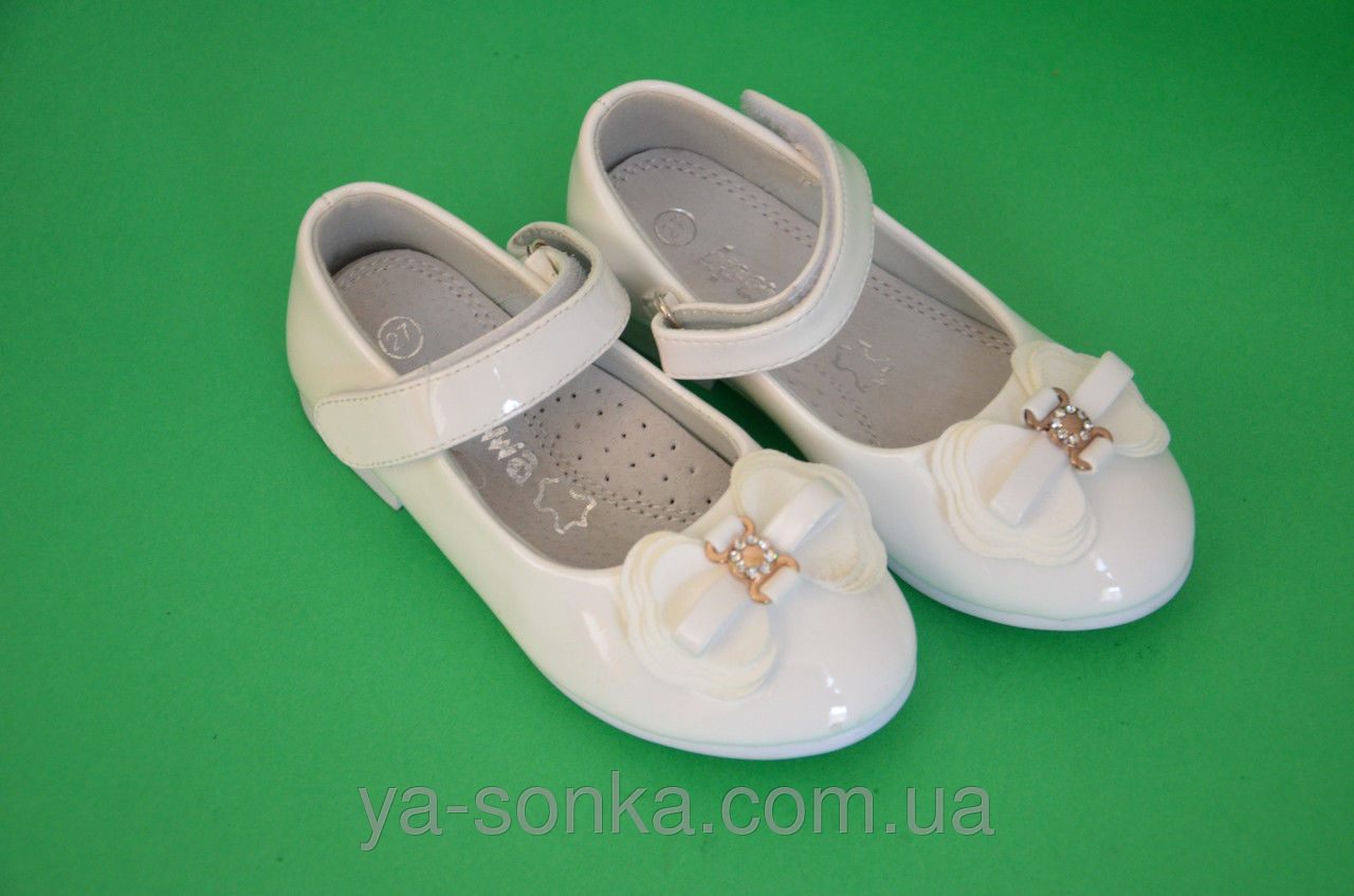 Стильные, модные туфельки для маленькой леди.  Выполнены из качественного кожзама под лак белого цвета. Декоративные строчки. Довольно открытая модель. Ремешок позволяет надежно фиксировать туфельки на ножке. Застежка на липучке. Модель украшена кокетливым бантиком.