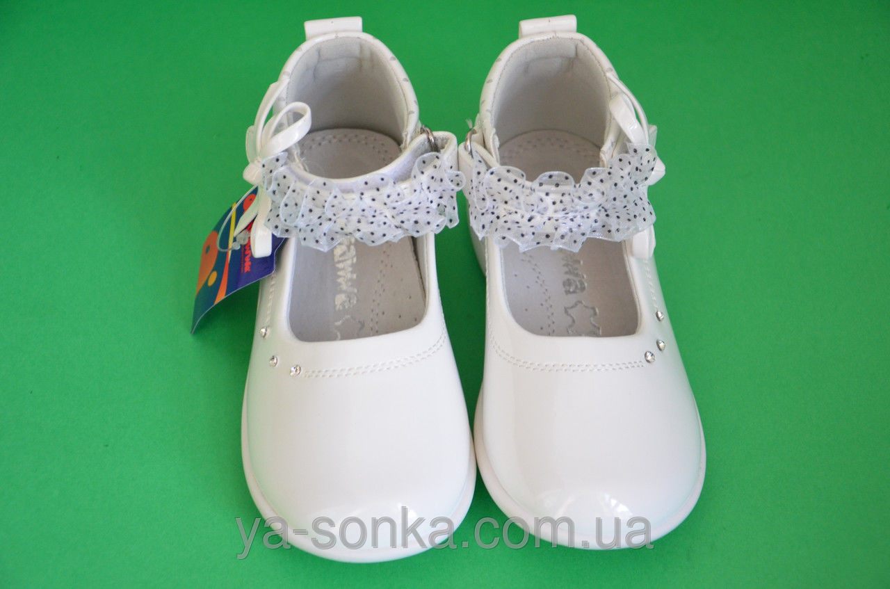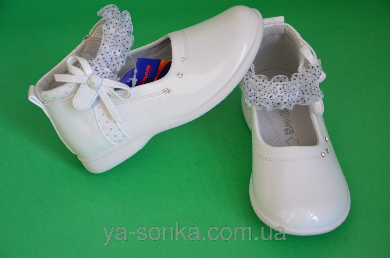 Шикарные, модные туфельки для юной леди.  Выполнены из качественного кожзама под лак белого цвета. Хороший высокий задник. Ремешок украшен изящной капроновой ленточкой. Ремешок позволяет надежно фиксировать туфельки на ножке. Застежка на липучке регулирует полноту.