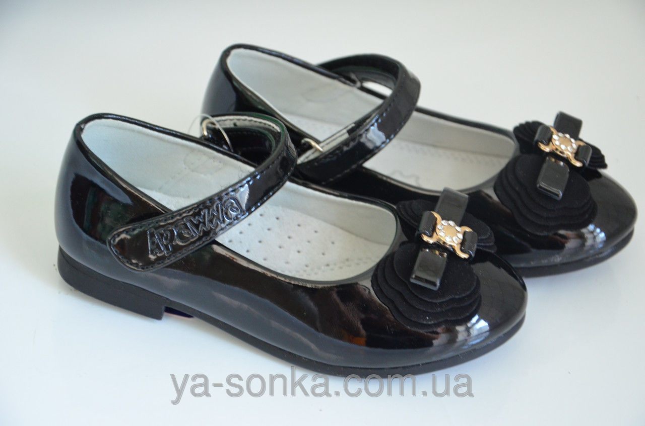 Стильные, модные туфельки для юной леди.  Выполнены из качественного кожзама под лак черного цвета.  Ремешок с застежкой на липучке регулирует полноту.  Модель украшена шикарным бантиком с брошкой.