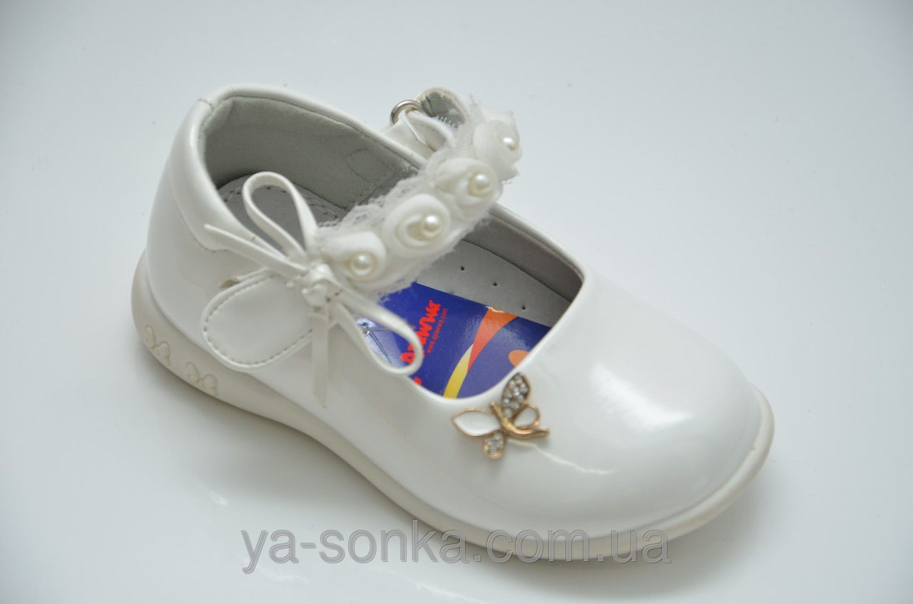 Очень изящная и нежная модель для маленькой принцессы. Выполнены  из качественного кожзама под лак белого цвета. Туфельки на ремешке, застежка-липучка. Украшены цветочками с бисером,  брошкой-бабочкой.