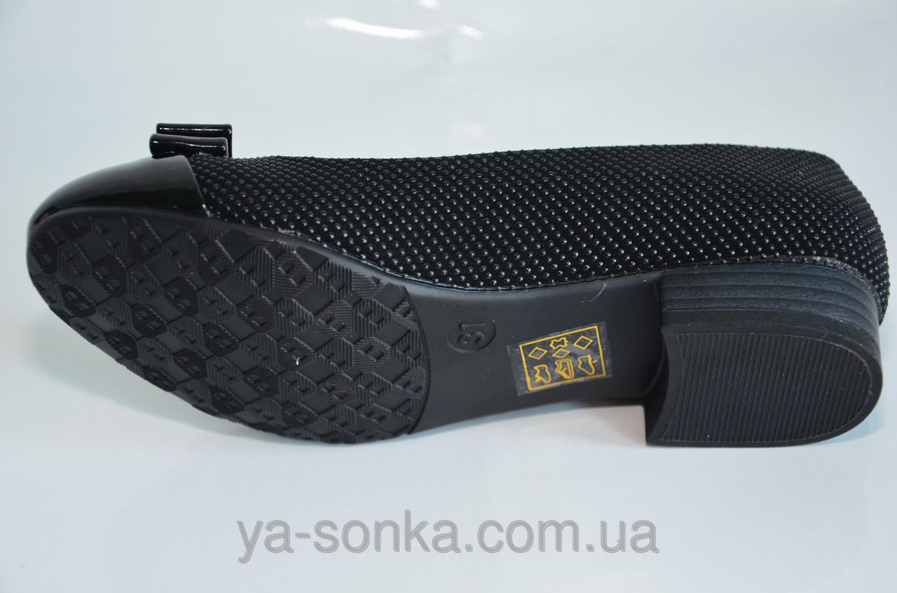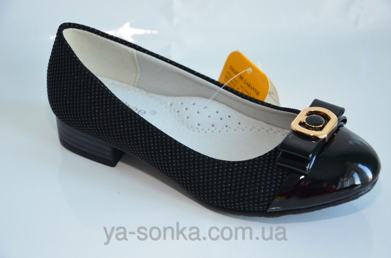 Стильные туфли для девочки. Внутри кожа, сверху искусственная кожа под лак в комбинации с  рифленым материалом. Модель украшена стильным бантиком с брошкой. Кожана стелька с  супинатором для профилактики плоскостопия.