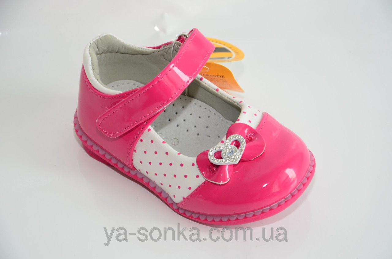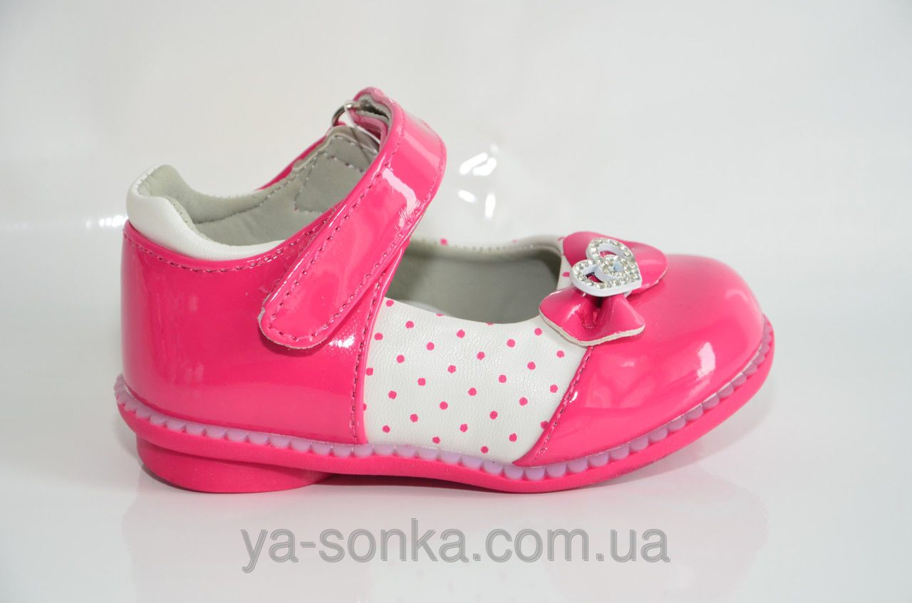 Чудесные туфельки для маленькой принцессы. Изготовлены из качественного кожзама под кожу-лак розового цвета в комбинации со светлыми вставочками.  Ремешок на застежке-липучке. Украшает модель изящный бантик с брошкой-сердечком.
