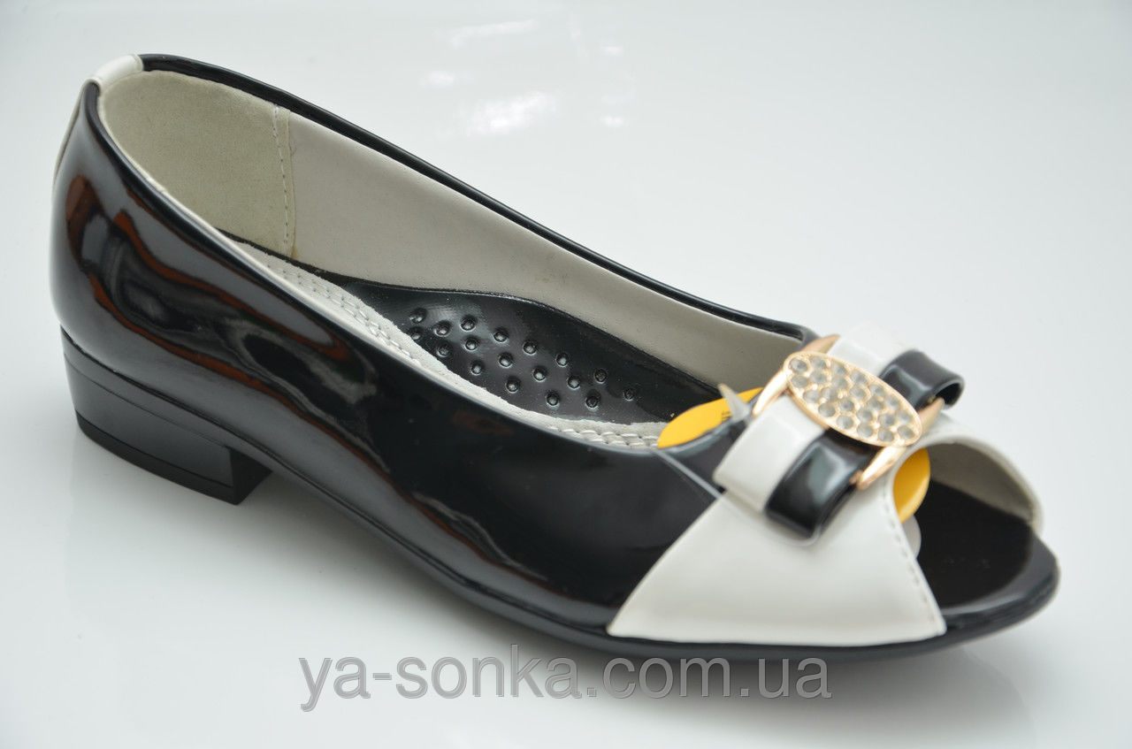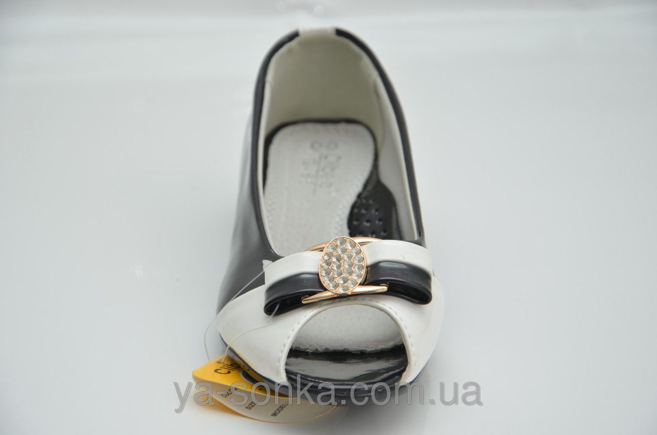 Туфли-босоножки для девочек. Закрытая пятка, открытый носочек. Красивая элегантная модель, украшена бантиком с брошкой. Классическое сочетание черного с белым. Подойдет как к нарядному платью, так и с брюкам.