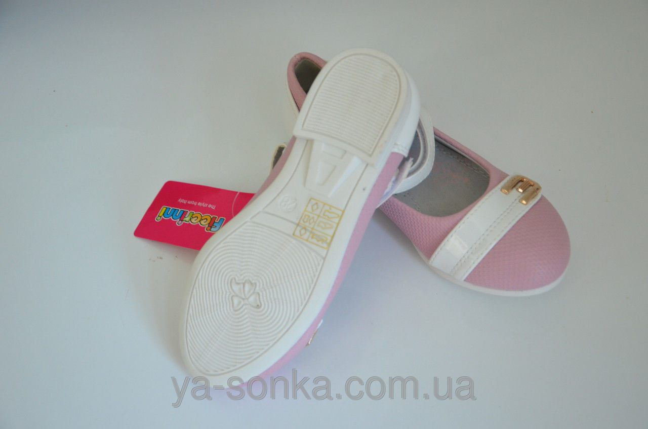 Стильные  модные туфли для юной леди. Выполнены из качественного кожзама в комбинации розового и белого цветов. Ремешок с застежкой на липучке регулирует полноту ножки. Застежка на липучке. Аксессуар - изящная брошка.